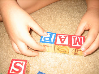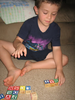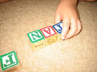 My preschooler has learned his ag, at, an, ad & ap words in his Hooked on Phonics Learn to Read program so I am looking for different ways to review those words with him before we move onto the ig words in another week. So today we tried something new. I set aside the blocks: A, T, P, G, D, N (that would make up the last 2 letters of the words he has learned) then I set various other letters in a pile & had him for the most part put together the words he has learned. So for instance I put the AT blocks together then from the other pile he would make up words he knows (cat, hat, mat, etc.)