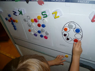 I know I posted this before, but I made my kids Easter Magnet Pages . My preschooler used circle magnets to fill in the circles and my toddler used her ink dobbers to fill in the circles.