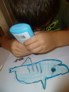 Using our glue paint the kids drew their own sea creatures and used the glue paint to accent their drawings then I had my son write a story about this drawing.