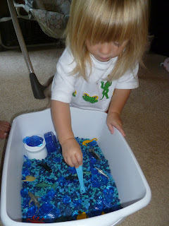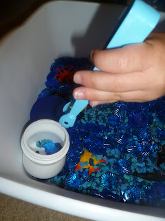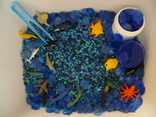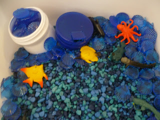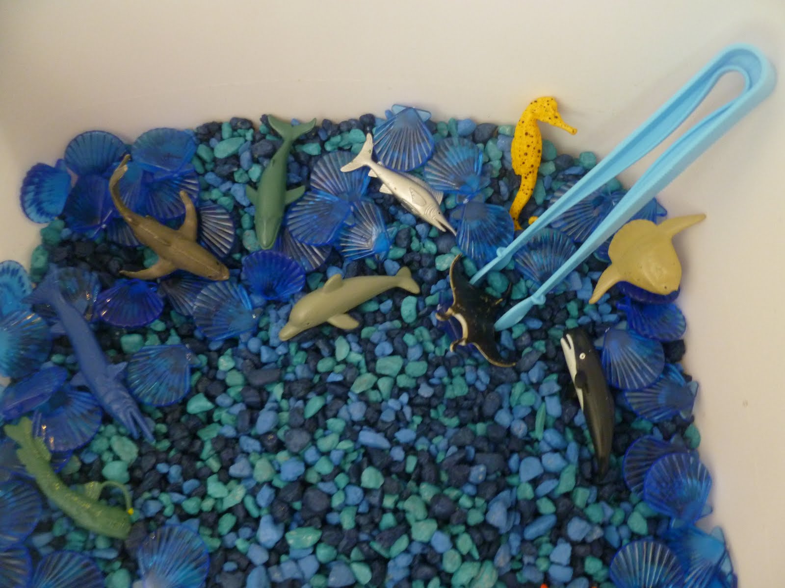 Since I am Doing Apologia Swimming Creatures 5th day with my 6 year old this year with accompanying crafts for him and my 4 year old, I figured I would put together a ocean theme sensory bin for them to play with – I will keep it for most of the year.