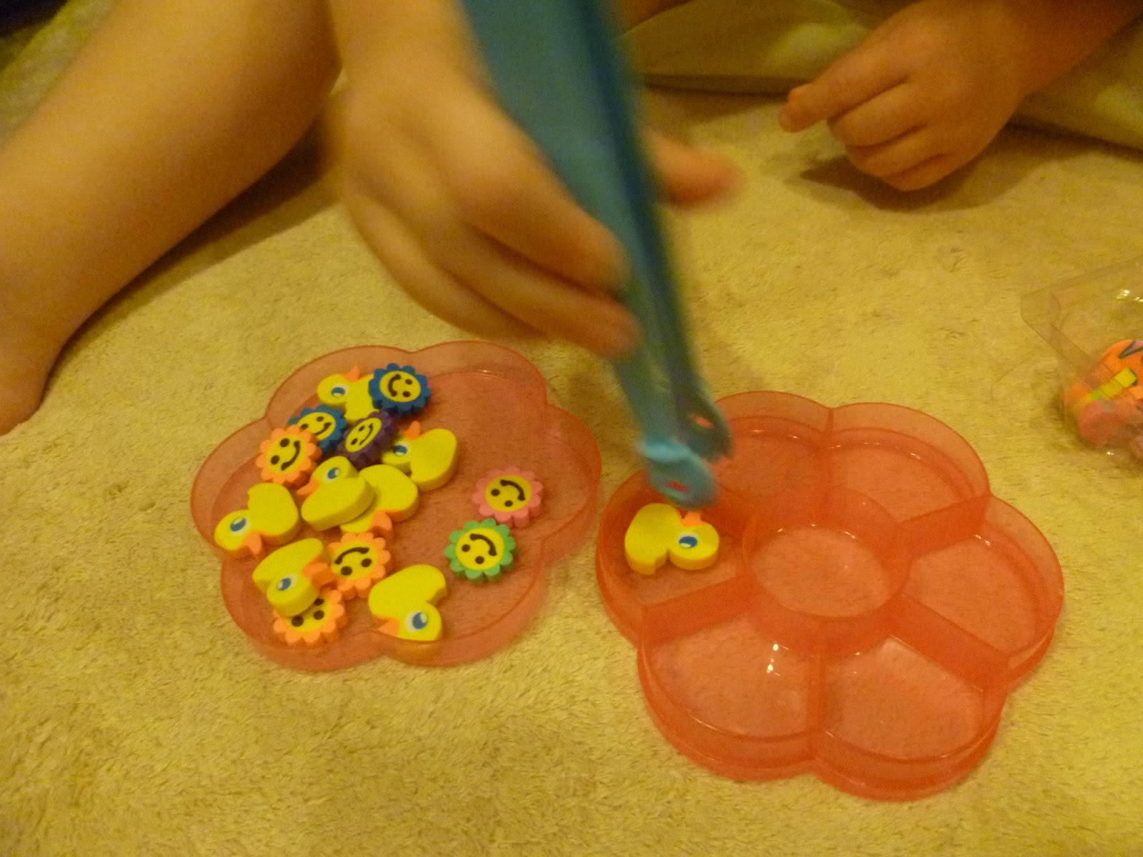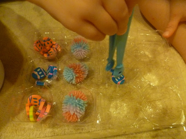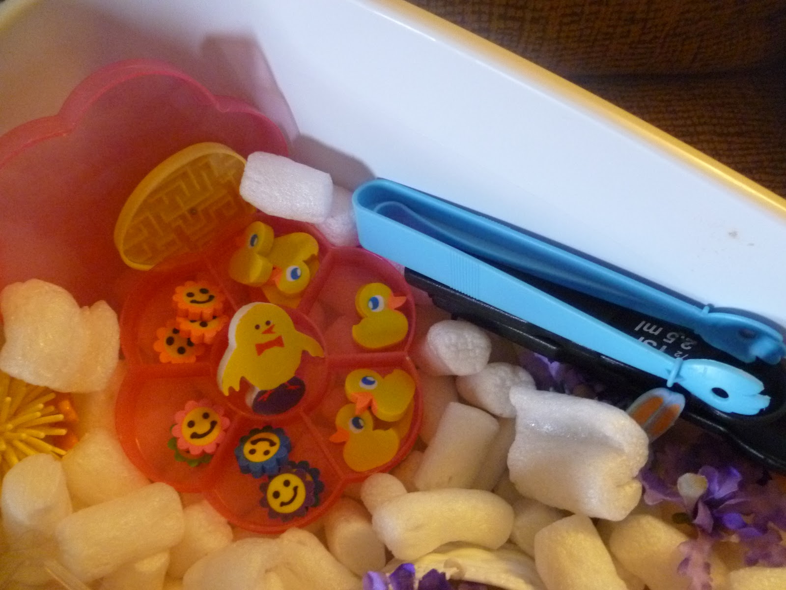 Transferring small items into a container and then placing the lid on it. Transferring items with the measuring spoon from various containers with and without lids. Great for dexterity and hand and eye coordination.