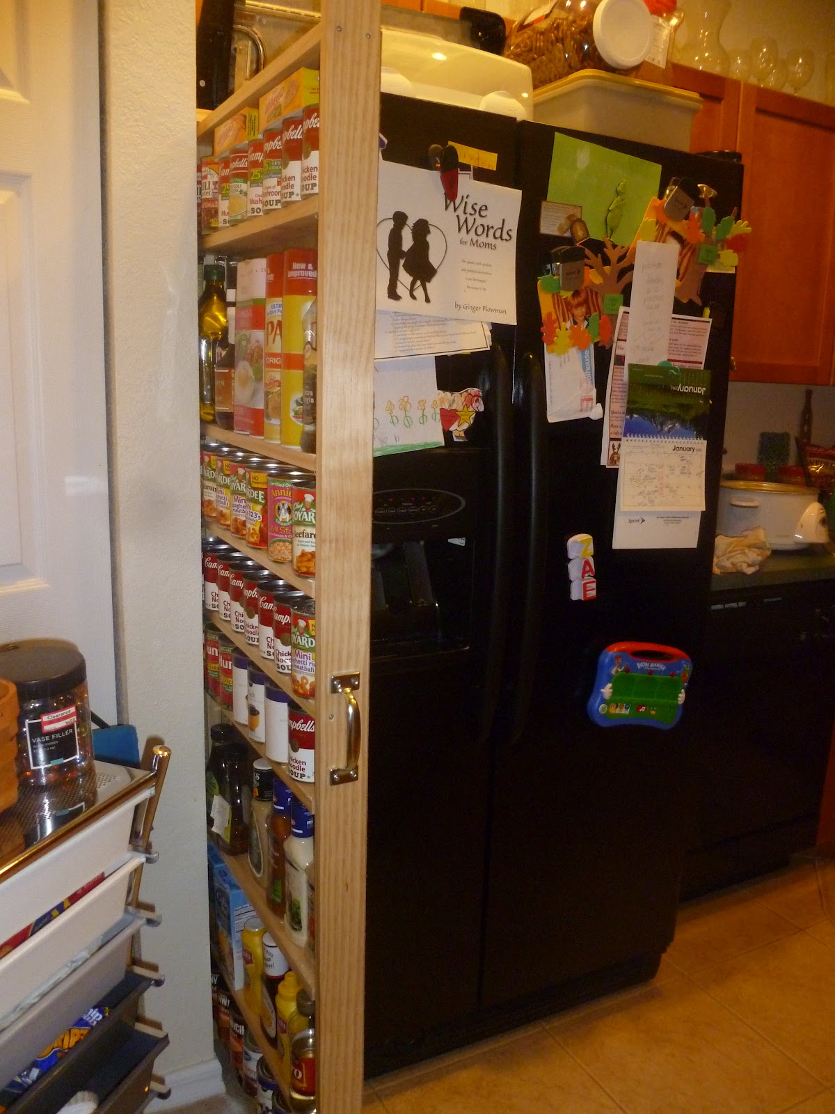 This slider my husband made slides between our fridge and pantry closet. It has castor’s on the bottom making it easy to pull out. Now my pantry is not so cluttered, I moved the can goods into my slider and was able to remove the clutter from the top of the fridge into the pantry!