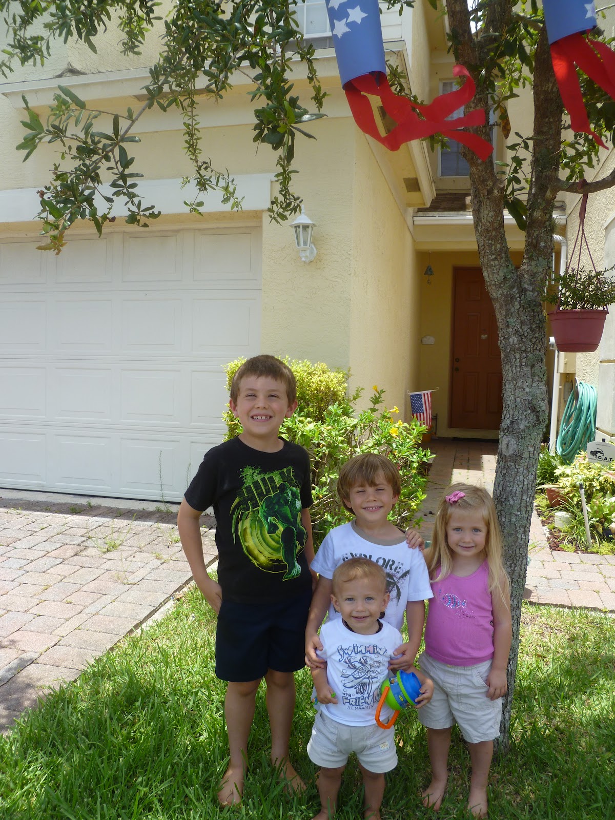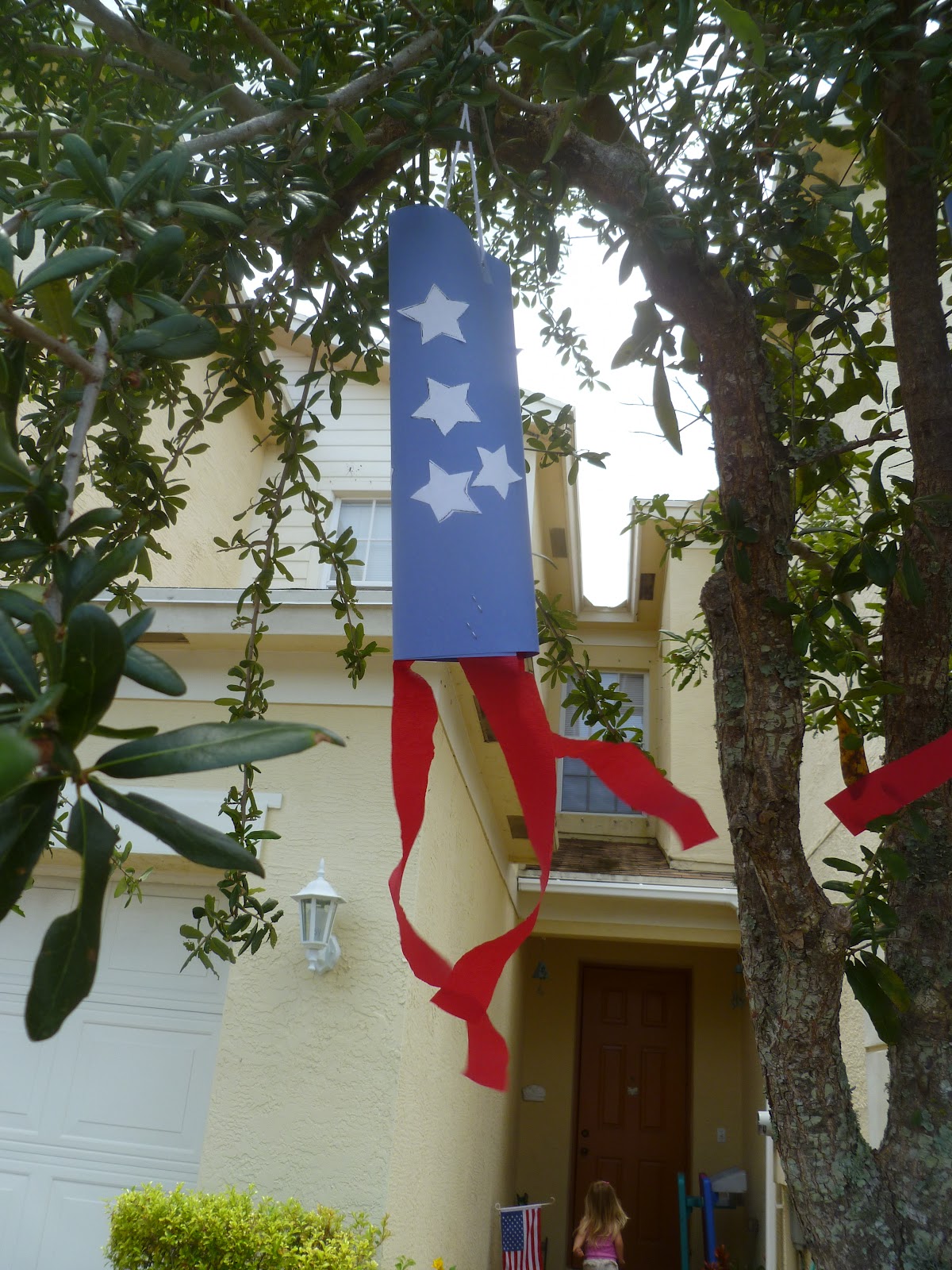 We went to the library this morning where the kids made patriotic crafts. Here is one of the crafts they made that they hung from our tree in the front yard — a patriotic wind sock.