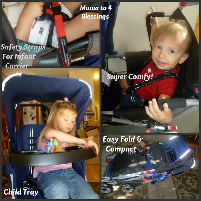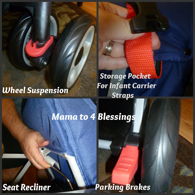 ~ All-wheel suspension, linked parking brakes, over-sized canopy and large size storage basket with side pockets.