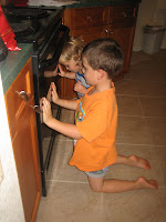 boys watching the Shrinky Dinks “shrink” in the oven.