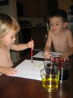 The last 2 weeks I have been teaching my toddler his colors, this week I did a fun hands on activity with him (which I will post under tot teachin’)I took glasses of water & had him add food coloring to them so he could see the water turn colors. After we were done I looked at these glasses full of food coloring & I thought I hate to just throw these away. What can I do with them – I got it! I took out some paper & paint brushes & my boys painted!