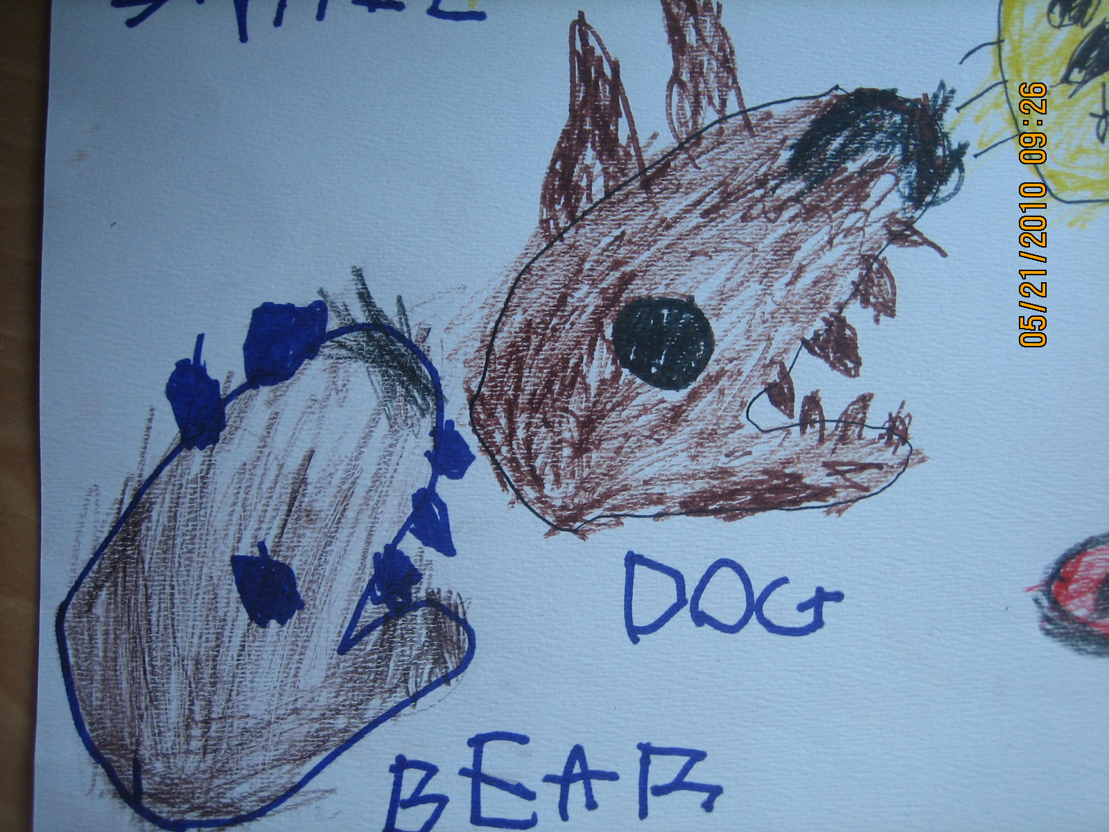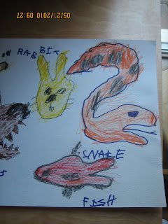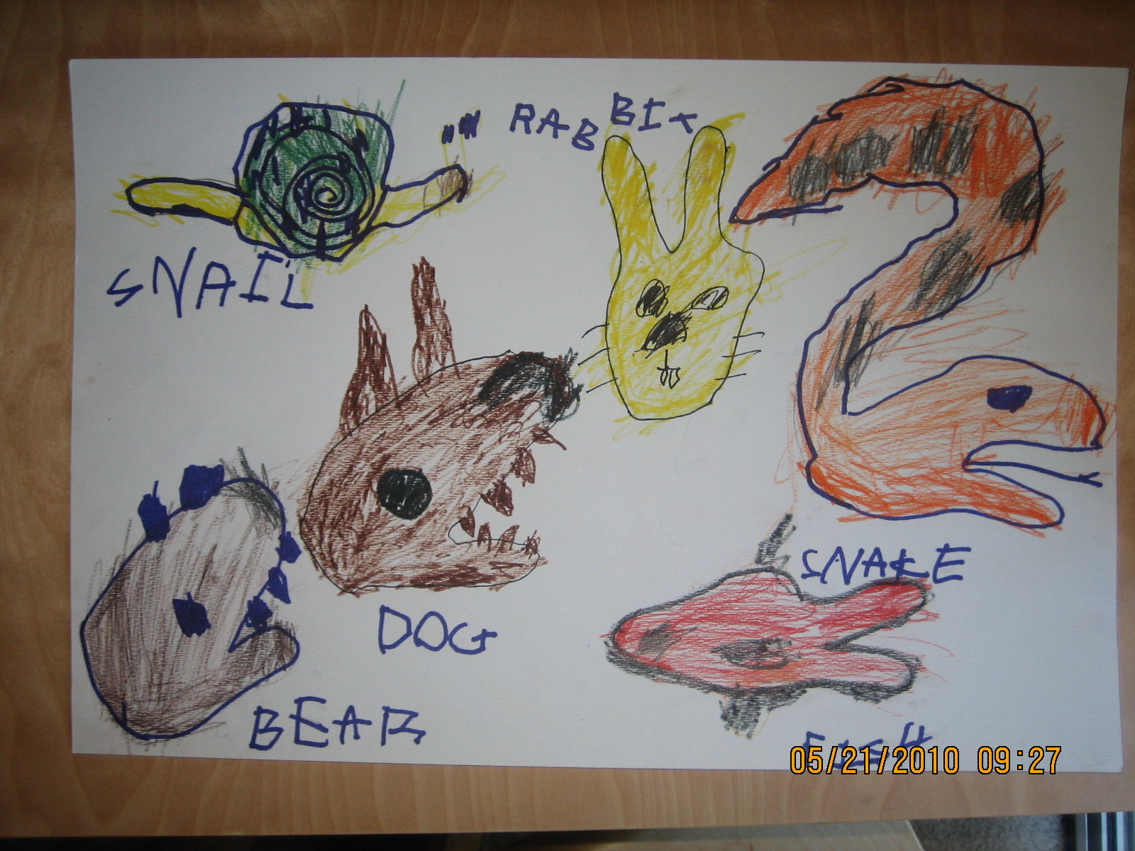 Rabbit (traced with all fingers in except for the index & middle fingers), Snake (the face was done by tracing his hand on its side – I did help him the body part too, Fish same as the Rabbit but done sideways.