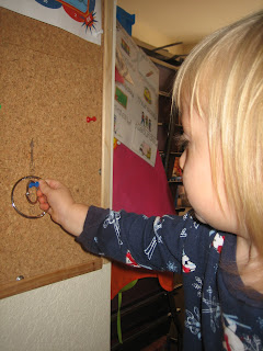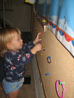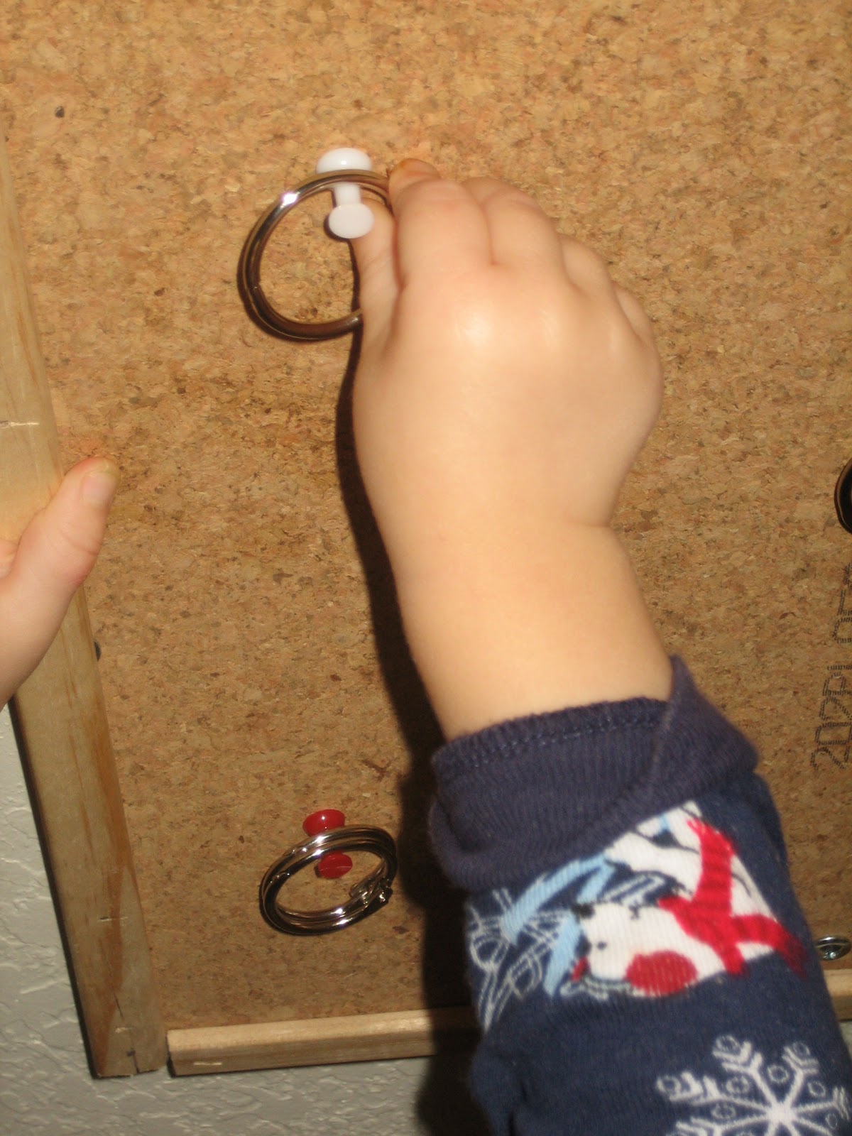 Then I gave her binder rings in different sizes to place on the push pins. Some she placed one ring on, some 2 or more on. She loved this and as a matter of fact her older brother saw her doing this and wanted to do it too!
