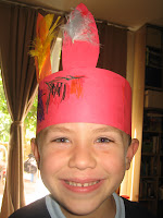 We made Native American Bands, I cut construction paper in 3 strips, hand cut feathers. They colored their bands and glued feathers to the paper feathers.