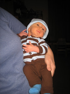 These pics were taken this week, I had to take him in this outfit – my mom bought him for Christmas – it’s so tiny. He is still wearing preemie clothes. He is a little guy!