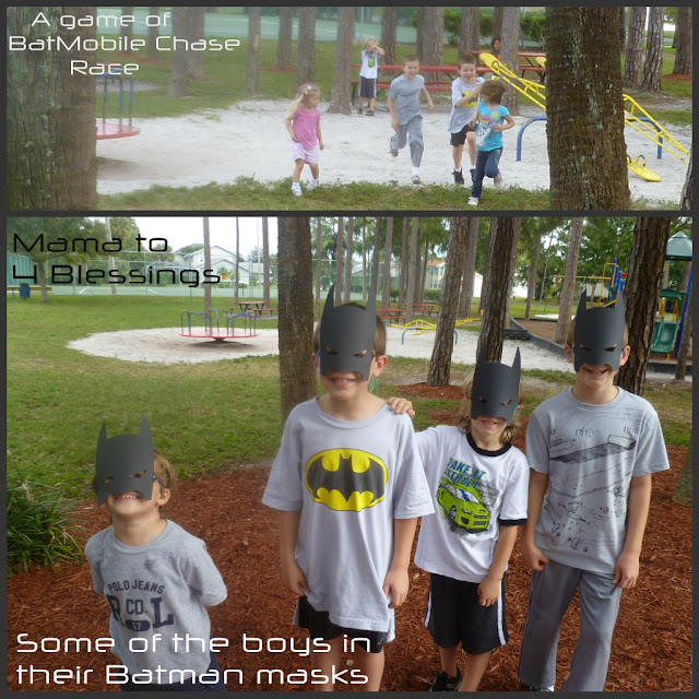 And then the boys put on their Batman masks which I made from black card stock. I printed off, traced, cut out and then used yarn to tie the backs.