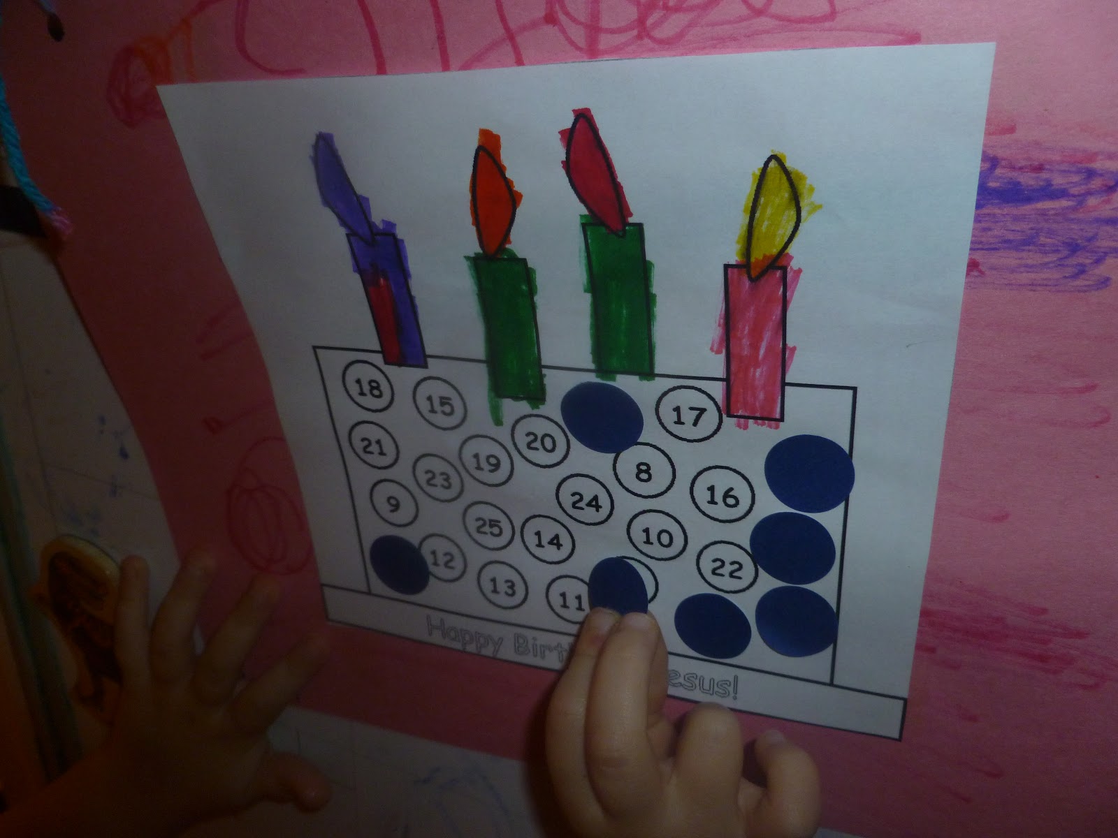 I printed off a Happy Birthday Jesus Advent for my daughter and cut it out and had her choose what color construction paper she wanted her Jesus cake to go on, she colored it some and then glued the Advent cake to the construction paper. I hole punched holes and tired yarn through it and hung it up and each day she takes a colored circle and places on that particular day.