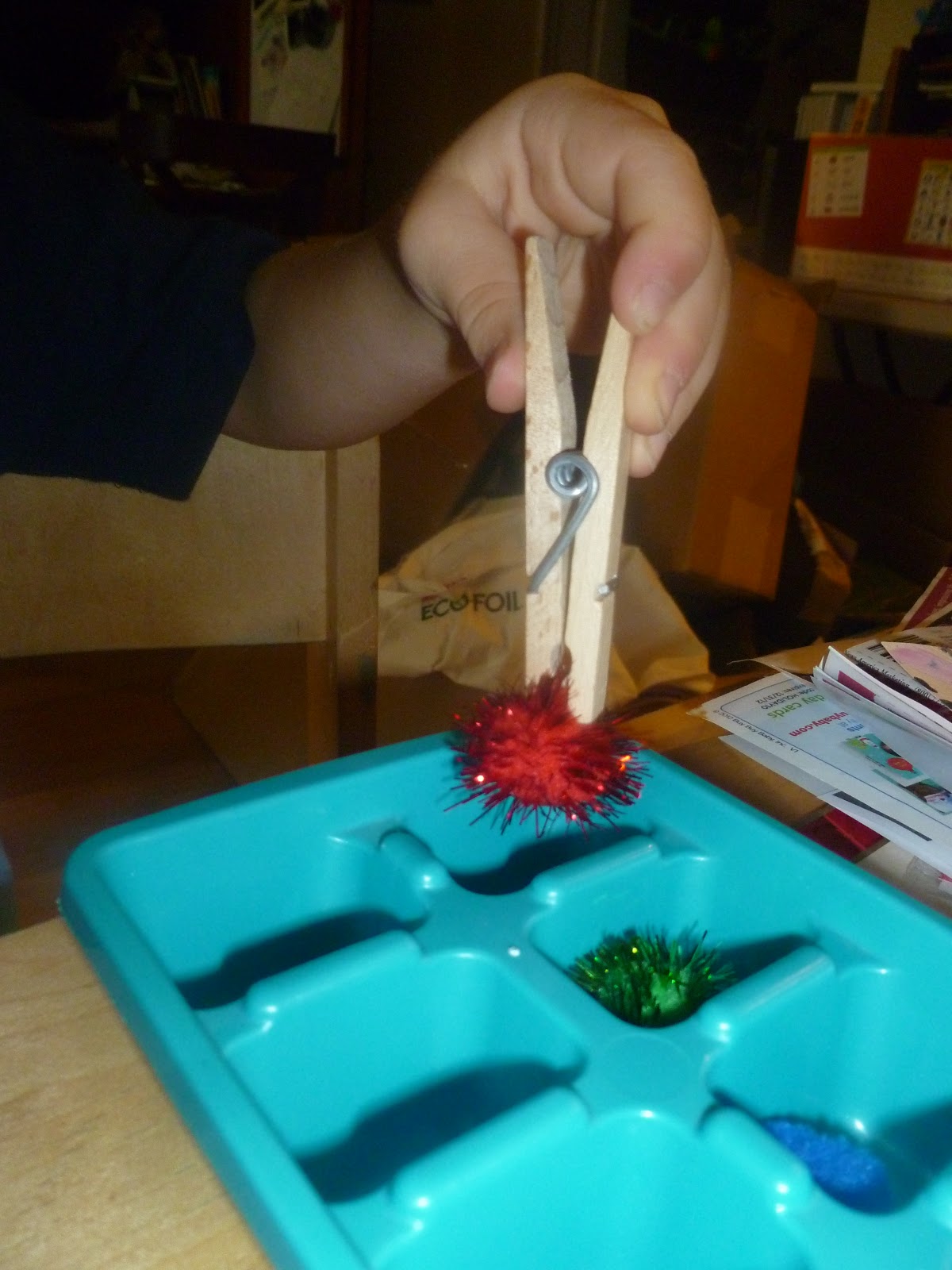 During black Friday I grabbed this Christmas colored bag of pom poms. I laid them out along with tongs, a small measuring spoon, a clothes pin and a ice cube tray.