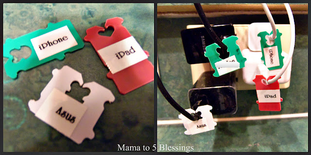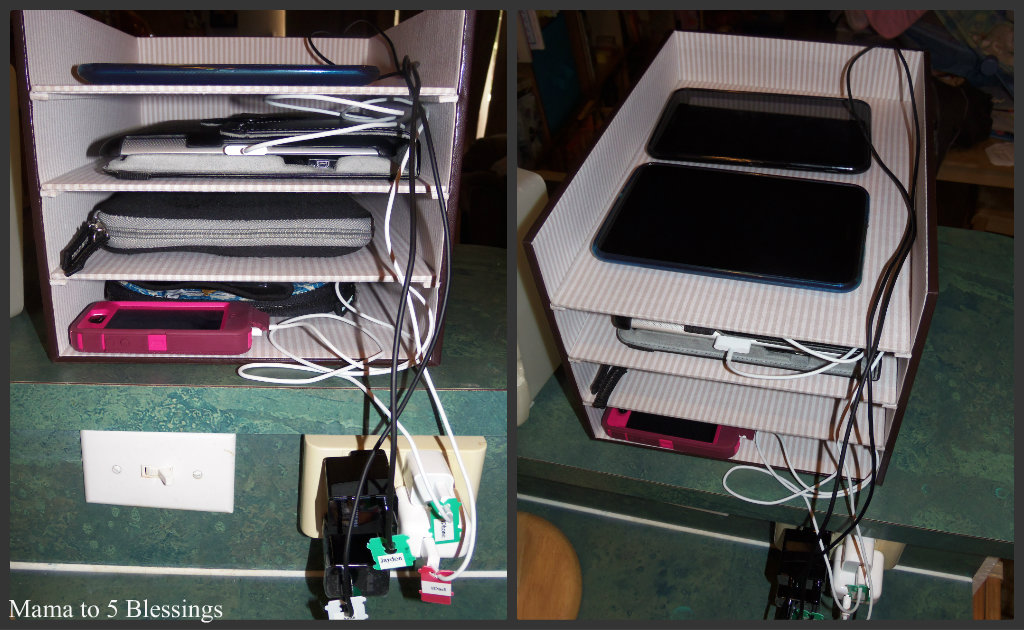 Office Depot carries these office organizers which we are using, each tablet has it’s own shelf. When we need to charge one of the items, we look at the bread tie tag and match it up to the correct electronic! So much better than cords and electronics all over my kitchen counter!